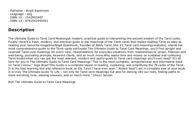 The Ultimate Guide To Tarot Card Meanings - The Ultimate Guide to Tarot Card Meanings by Brigit Esselmont. Get your free tarot card meanings reference guide discover the simple tool to quickly & easily interpret every single card develop a unique connection with the cards & learn all 78 meanings in no time Tarot card meanings are easier to find, compare and analyse! If you know the name of the card, at the top of the page we have search. Action can lead to accomplishments, but also to conflict, battles and hatred when used in the wrong way. Sure, there are traditional interpretations of what the tarot cards mean, but i encourage you to trust your intuition and go with the meanings that feel right for you.